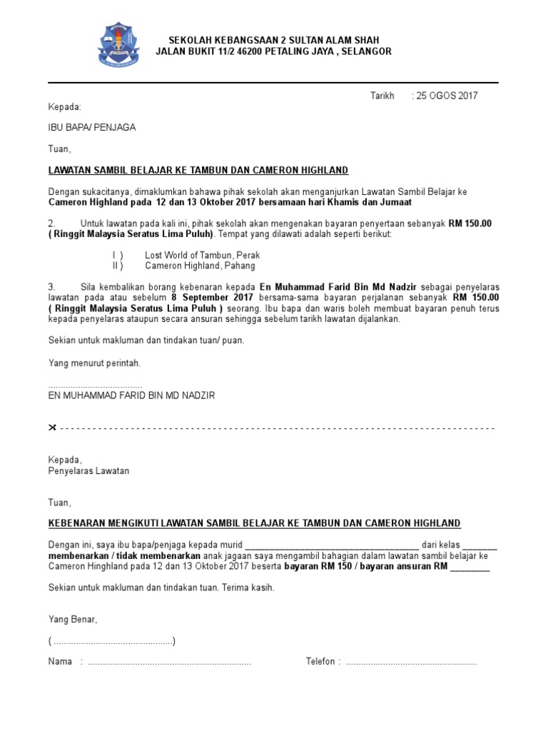 Dalam melaksanakan kegiatan lawatan, beberapa langkah perlu diambil bukan sahaja untuk memelihara keselamatan dan kebajikan murid tetapi suapaya kegiatan yang dianjurkan memberi manfaat kepada pengalaman pembelajaran murid. Untuk melihat detail lagu contoh surat rasmi lawatan sambil belajar ke universiti klik salah satu judul yang cocok. Text of surat lawatan sambil bljr. Saya bagi pihak persatuan bahasa melayu sekolah ini ingin memaklumkan bahawa persatuan kami bercadang untuk mengadakan lawatan sambil belajar ke unit akhbar dalam darjah ( add ) pada 27 januari 1997, jam 9.30 pagi. Contoh surat permohonan kebenaran lawatan sambil belajar.