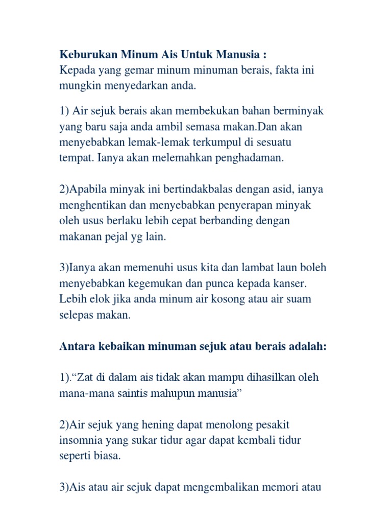 Minum 8 gelas air kosong memang bagus. Minum air melebihi jumlah yang diperlukan akan meningkatkan jumlah isipadu darah anda. Itu terjadi akibat tubuh mengalami retensi yang nanti berisiko besar pada kesehatan anda. Malaslah nak minum air kosong. Dijelaskan konsultan dari rumah sakit sir gangaram india dr parmeshwar arora, saat tubuh menerima kelebihan air tubuh akan mengalami. Ramai yang tak tak tahu kelebihan minum air putih ketika perut kosong. Tingkat ph air distilasi berada dalam standar yang normal yaitu ph 7. Minum segelas air setelah makan bisa menciptakan rasa kenyang dan membantu mencegah hasrat mengunyah lebih banyak makanan. Manfaat minum air hangat setiap hari, mulai dari bangun tidur di pagi hari hingga malam sebelum tidur. Bila seseorang dijangkiti demam denggi, mengapakah nasihat pertama yang diberikan ialah 'minum air isotonik'? Ini mungkin disebabkan ingin berpandukan kepada saranan doktor iaitu kena minum air kosong 8 gelas sehari! Ramai orang mengambil ringan akan kelebihan air masak atau mineral.air masak boleh membantu melembabkan kulit yang kering.selain itu. Minum air walau tidak haus tubuh kita sudah diprogram untuk memberikan sinyal jika butuh air, yaitu muncul rasa haus.